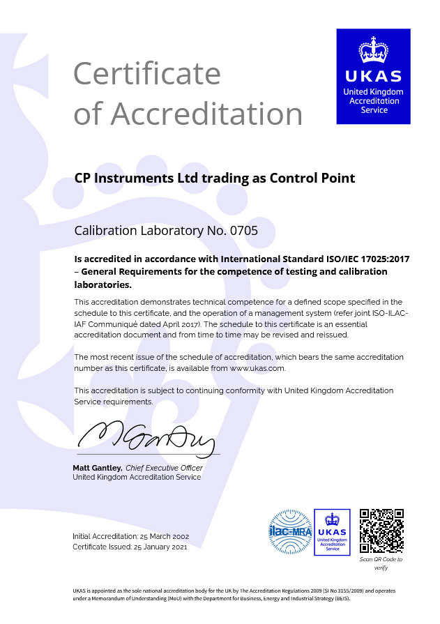 Control Point are respected instrumentation specialists and have been accredited to UKAS 17025 for the calibration of temperature instruments by electrical simulation since 2002. Our UKAS scope of accreditation was extended in 2022 to include, Temperature Uniformity Surveys, Sensor Calibrations & Time Checks.